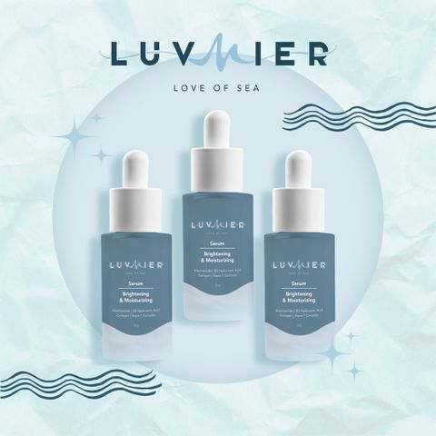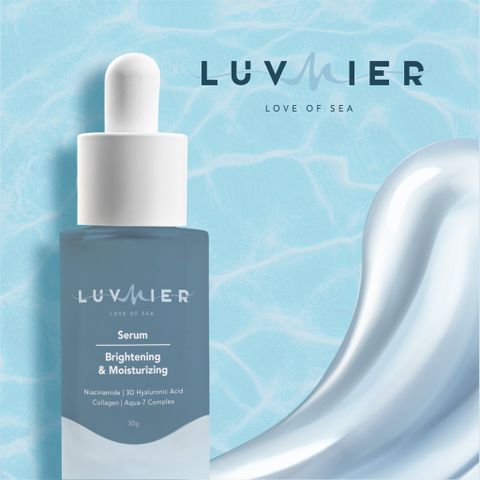 Luvmier Dewy Brightening Serum chứa thành phần chính gồm vitamin B5 kết hợp với Niacinamide, phức hợp 7 loại tảo biển Aqua-7, 5D HA, collagen biển cho tác dụng: